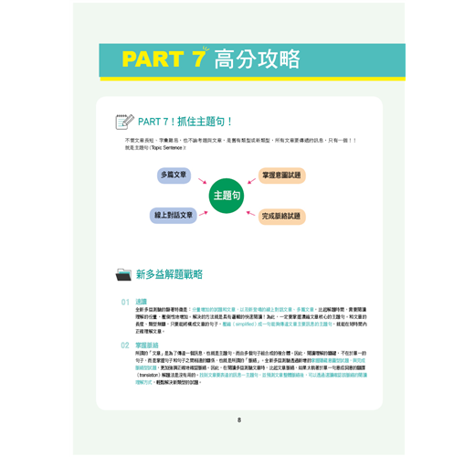 在閱讀多益測驗文章時,如果太執著於單一句意,或詞意的翻譯,是沒有用的。最重要的是,找到文章要表達的訊息:「主題句」。您可以透過「速讀」方式,輕鬆解決新類型的試題。