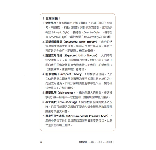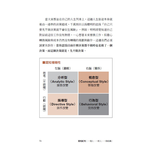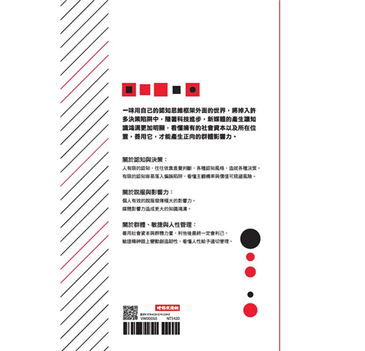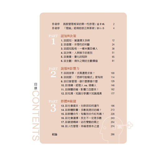 個人要有動態能力與變動思維,企業要有敏捷精神與韌性,明白企業群體中的人性需求,創造彈性自主的營運規則;經營者懂得讓員工獲得認同以及在組織間得到良好的人際關係,最佳的人性管理需要將利己與利他充分融合,個人、群體與企業方能平衡穩定正向發展。――摘自本書〈第三篇:群體、敏捷與人性管理〉