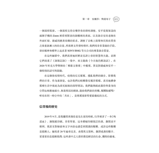 她的情感隨著安麗莎師母苦難中的敘述而自然起伏,當讀到「在地上我從未有過像你們那親密如我兄弟姐妹般的人」一句時,我看見眼淚滿了她的眼眶。我們沒有預演,也沒有必要錄第二遍,因為聖靈的感動,她的分寸把握堪稱完美。2020 年5 月上旬,在北京疫情剛穩定下來後的一週,我們擔心錄音工作可能再次關閉,所以利用緊湊的半天時間,完成了錄歌、錄信的全過程。而8 個月前在台北錄製,沒有一封信的錄製是一遍過的。