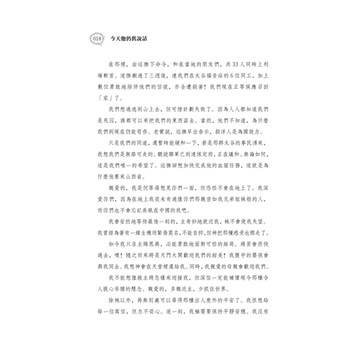 這是一本導演手札,回顧了他拍攝《因信說話》期間不為人知的心路歷程和幕後花絮;這是一個電影劇本,蒙太奇地將魔幻的現實和真實的歷史無縫對接,交織疊印;這也是他的抗疫日記,讓我們看到那如雲彩般的見證如何幫助他勝過封城帶來的絕望和恐懼,用意識流的筆法展現了一種超越時間和地域,不屬於這個世界卻存在於其中的信心、盼望和愛。
