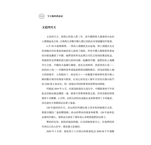 2022年4月,新冠疫情已進入第三年。當禁閉的生活變成瀰漫的焦慮,本書作者回溯至120年前的4月——彼時,席捲全國的「義和團運動」讓這塊土地上的民眾遭受荼毒,宣教士也面臨各種悲慘處境。