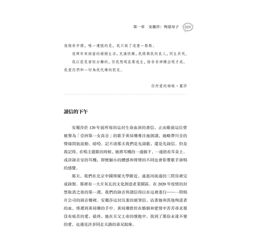 那天,我們在北京中國傳媒大學附近,通惠河南邊的三間房裡完成錄製。那裡有一大片灰瓦的文化創意產業園區。在2020年疫情的封禁取消之後的第一週,我們的錄音與讀信得以在這裡進行——一間唱片公司的錄音棚裡。安麗莎這封沉重的絕筆信,沾著她和其他殉道者的血,傳遞到黃綺珊的手中。黃綺珊曾經在婚姻和愛情中苦苦尋求那沒有痛苦的愛,最終,她在天父上帝的懷抱中,找到了那份永遠不變的愛,也遇見許多同走天路的弟兄姐妹。