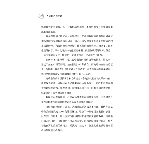 張強的這部書將他自己在這三年中從四處奔波到與封控隔離的現實生活,與他所拍攝和講述的人物交替穿插地連接在一起,形成一部風格獨特的散文隨筆集,也是一部《因信說話》節目製作編輯手記。他讓我們這些讀者不斷地進出一道「門」,門這邊是眼見的現實,門那邊是另一個時空裡的現實,但更是那眼未見的「確據」、所信之事的「實底」。