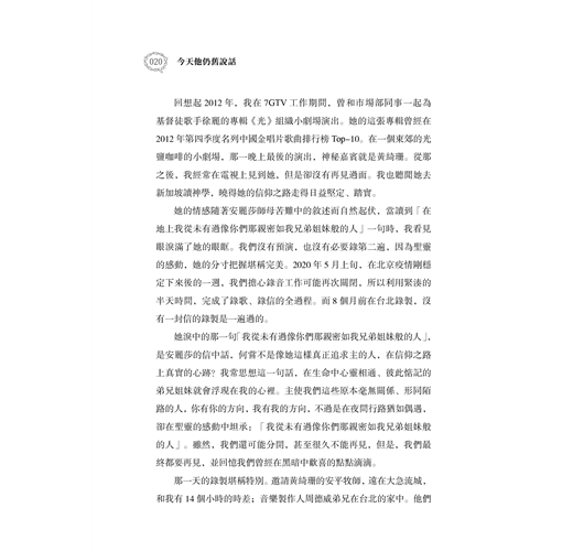 《因信說話》節目雖有千萬次的播放量,在嚴苛的管控下,數據已然歸零。倘若《今天他仍舊說話》作為紙質書能够出版,更好地被閱讀和傳播,給華人基督徒帶去更長久的祝福,坦然面對未知的一切,就是筆者及節目所有製作者共同的心願。