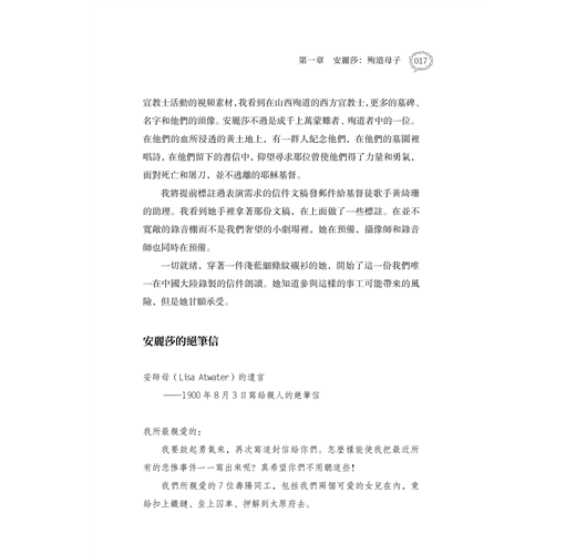 本書是節目編導張強歷時兩年有餘,在新冠疫情期間,重新梳理和記述了八位宣教士、基督徒文化人士,不為人知的另一面。其中有殉道者安麗莎的痛與愛,有蘇慧廉的宣教事業對當下社會與福音的啟發,有戴德生與「揚州教案」的故事,也有路易斯、梵谷、張曉風等的文化關切……作者以真實細膩的文筆,穿越歷史與當下,使我們看見掌管歷史的那一位,在今天這個充滿不確定性且撕裂的世界中,仍舊向我們說話。