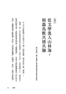 別誤會,這裡並不是要說文學中的「環境」,有別於現實世界的「環境」。不是的,畢竟地球只有一個,包括人在內的萬物身處於同一個地球環境。但即使萬物皆身處於同個地球尺度裡的自然,是文學讓「身處」成為關鍵,讓我們不會只是以旁觀者的視角讀課本、看新聞,以一種置身於自然之外看環境。相對的,文學讓我們隨著作家的文字,一起進入環境、領略自然;讓閱讀成為魔力,轉換讀者那狀似只是觀看「外在環境」的視角,把我們拉進作家們身體的所在,在敘事場景裡一同與文字在場、「身處」於自然。