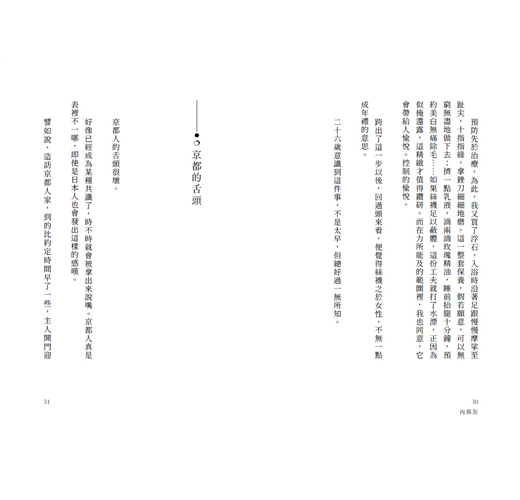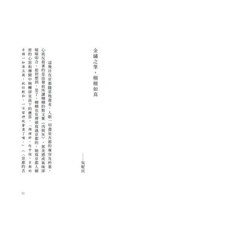 這幾日在京都隨意地遊走,入眼一切盡是古都的雍容及矜重,心底反芻著的是出發前所讀栩栩的散文集《肉與灰》,那美感或氣味卻暗暗叩合。起初想到,是了,栩栩也在裡頭寫過京都的,她寫京都人細密的心思和傳聞中婉轉卻見高下的應答,「綿裡針,肉中核,京都的舌頭一如湯豆腐,狀似軟和,一不留神就會燙了嘴。」(〈京都的舌頭〉)其次才想起,栩栩素來纖緻的文字,敏於觀察的眼光,不也有這樣聰慧善感之貌?我試著尋找栩栩與京都的連結,得出一個頗有意思的結論——啊,或許因為栩栩出身養成於臺南,那座氣質與地理位置皆常被類比為京都的城市。