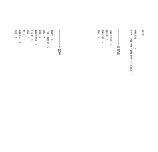 書分五輯,從最薄最精緻的寫起。開卷「琉璃脆」裡,栩栩再度發揮她擅於勾勒細物的功力。我尤其喜歡她寫豆花的〈陽春白雪〉,報章登出後重讀多次,由這篇小品能見識栩栩對語言質地的嫻熟——她以「瑩白如酪,味淡近於寡」「清冷潔淨」形容豆花;接著,用「煙韌軟糯」描述樹薯粉圓類配料的口感。豆子的顆粒感,她說是「玉粒金波」;口唇間一抿而化的軟熟花生,她下的詞是「敷在舌尖,分明又綢繆」。讀至此,就算只是吃豆花這樣的小事,也被她具詩質而高度展演的文字,把五官的感受放大了。