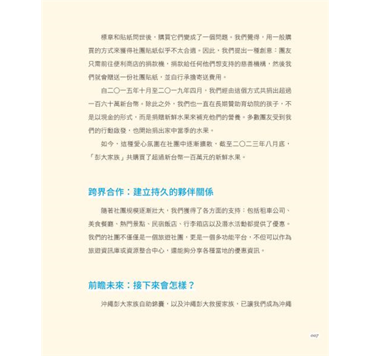 從此以後,彭大與這片擁有獨特風土和民情的島嶼形影不離。利用社團的龐大影響力,他不僅讓成員之間互相幫助,也積極尋找各種資源,甚至開始爭取各項福利。因此,一個名為「沖繩 彭大家族自助錦囊」的特別社團便此誕生。