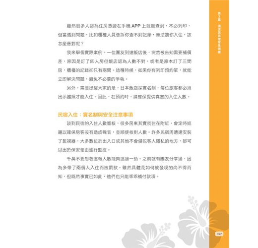 2、民宿的身分確認:與飯店不同,一般民宿會在報到當天要求影印護照。有些民宿在預約完成時就會要求傳送護照照片,這其實是房東遵守法律的表現,所以你可以安心。反之,如果民宿沒有要求這些資料,意味著民宿經營者較為「彈性」,但這並不一定是好事。(備註:例如Airbnb等民宿平台,會在會員註冊階段就要求掃描護照,提前確認身分。)