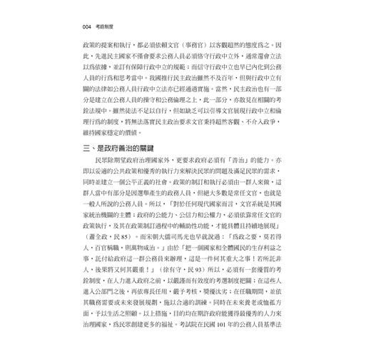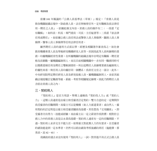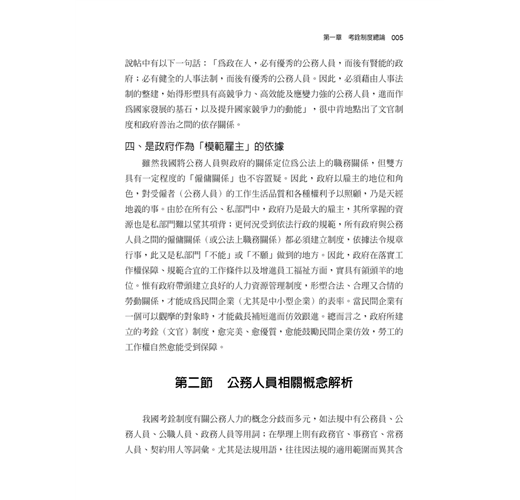 第一,公務人員退撫制度自112年7月1日起有重大變革。先前銓敘部官方說法將之定名為「公務人員退撫新制」,之後則定名為「公務人個人專戶退撫制」;兩者就給付、性質及財務責任面向有以下區別:前者為確定給付制、對於公務人員退休所得是確定的、且國家負最終財務保障責任,後者為確定提撥制、對於公務人員退休所得是不確定的、且國家幾無財務責任。本書作者特別以「系統思維」從以下三個層面分析:(一)對公務人員考選制度的延攬人才目的之影響;(二)對公務人員任用、陞遷制度之影響;(三)對公務人員倫理法制的影響。尤其以客觀、專業的角度,並佐以數據等對確定給付制與個人專戶制加以比較,是為目前學術界與實務界少見的論述。