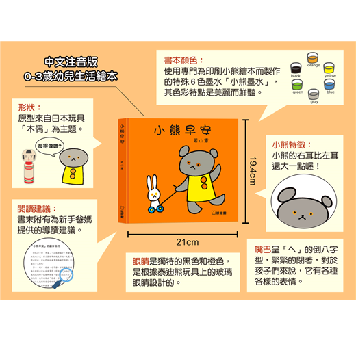 ★全書使用專為印刷小熊繪本設計的特殊6色墨水「小熊墨水」,色彩鮮明飽滿,有助孩子視覺發展