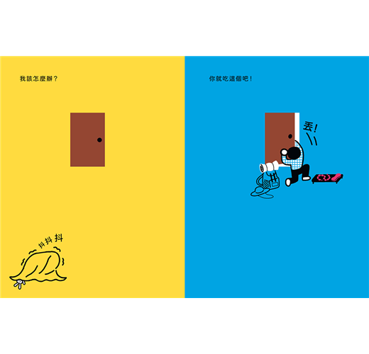 當獅子來到門外,藍色小子和黃色小子同樣從驚嚇出發!但藍小子一步一步的思考和行動,讀者將能看到真正的勇氣並且湧現「我也可以這麼做」的感受。