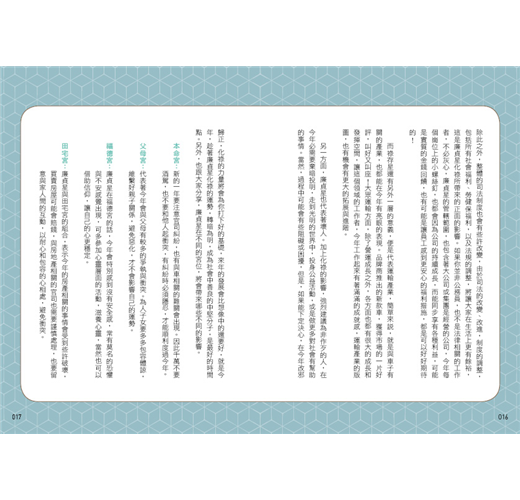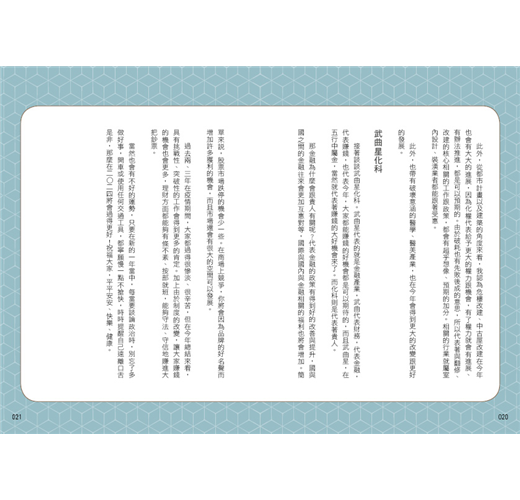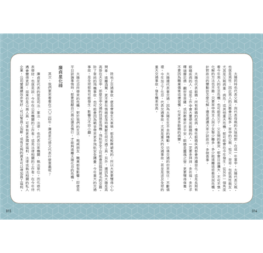 最後,無論富貴貧窮都一定會關心的財運,就得看「祿存星」,要搭配出生的西元年尾數,就能輕鬆判斷今年的財運運勢走向。此外,出生西元年還可以預測今年的災難,搭配「羊刃星」與「陀羅星」,就可以事先預防,減緩災厄帶來的影響。簡單利用出生資訊,就能找到在今年能大大幫助你的朋友、長輩,同時能避開災厄,無論你過去運勢如何,今年都一定要翻開這本書,掌握先機!