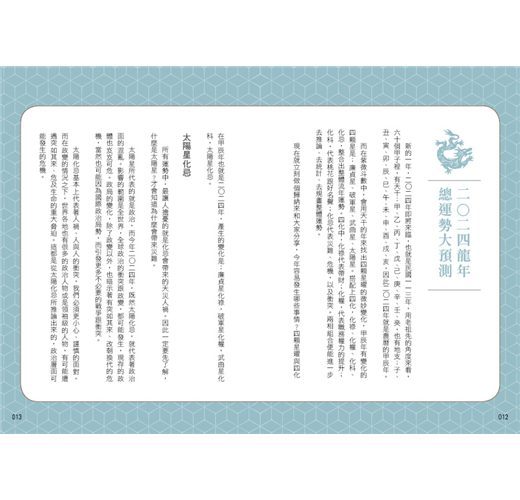 而在紫微斗數中,會用天干的年來找出四顆星曜的微妙變化,甲辰年有變化的四顆星是:廉貞星、破軍星、武曲星、太陽星。搭配上四化,化祿、化權、化科、化忌,整合出整體流年運勢。四化中,化祿代表帶財。化權,代表職務權力的提升。化科,代表桃花跟好名聲,化忌代表災難、危機以及衝突。兩相組合便能進一步去推論、去統計、去規劃整體運勢。