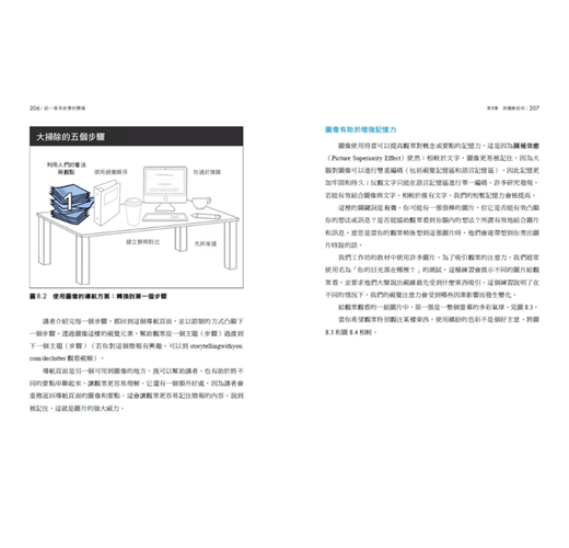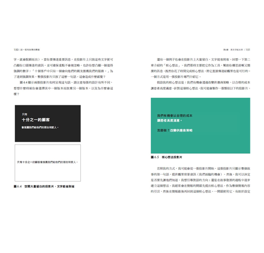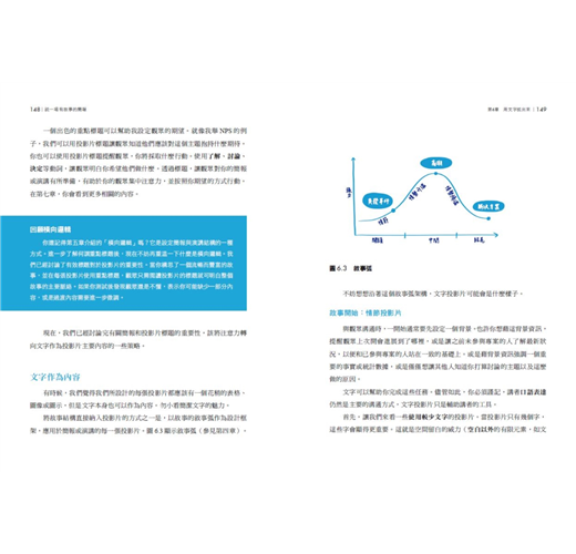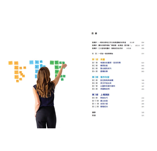 推薦序∣一場有故事性又符合商業邏輯的好表達 推薦序∣讓你的聽眾都能「願意聽,能溝通,想行動!」 推薦序∣三大區塊規畫好,簡報成效自然好 引言∥一切從一個故事開始 我如何踏上說故事之旅 為什麼你要成為說故事的高手? 本書適用對象 本書內容 第1部.規畫 第一章∥考慮你的觀眾,投其所需 .確定目標觀眾的優先次序 觀眾明確而且只有一位 縮小一群各式各樣觀眾的範圍 面對各式各樣的觀眾 .了解和評估你的觀眾 如果我不知道我的觀眾關心什麼怎麼辦? .根據觀眾需求量身定做溝通方式 一般做法 溝通內容與素材 環境 .考慮你的觀眾:TRIX個案研究 第二章∥構思訊息 .設計你的三分鐘故事 .構思核心想法 清楚表達你的觀點 傳達牽涉到哪些得失與利害關係 必須是個完整的句子 核心想法表單 與核心想法有關的常見問題 尋求回饋 在團隊的形式裡醞釀核心想法 .設計信息:TRIX個案研究 第三章∥整合資訊碎片 .學會熱愛傳統手工技術 .腦力激盪 我最喜的故事板工具:便利貼 我應該在便利貼上寫什麼? .考慮各種觀點 .編輯:修改與重新排列 丟棄也是門學問 我的核心想法應該出現在故事板的什麼地方? .徵求回饋意見 .一整個團隊一起製作故事板 .彙整碎片:TRIX個案研究 第四章∥建構故事 .常用方式:線性路徑 .什麼是故事? .故事的結構 基本的故事結構:情節、轉折和結局 敘事弧 現實是一座崎嶇不平的山 .將故事帶入職場 故事何時有效……何時可能無效 確認緊張點 沿著敘事弧架構安排訊息 .製作一個故事:TRIX個案研究 第2部.製作內容 第五章∥設定風格與結構 .首先是確立風格和結構 .確立風格 品牌形象決定風格走向 .確立你的風格:顏色 設定你自己的風格:字體 .製作投影片母片 從一張空白投影片開始 設定母片的主題投影片(theme slides)與內容投影片(content slides) 設計標題投影片和分頁投影片 .設定結構 為投影片命名 添加導航方案 在投影片檢視模式下看到所有投影片縮圖 .設置風格和結構:TRIX個案研究 第六章∥用文字說出來 .用文字為投影片添加標題 使用預示性標題 用投影片的標題有效傳達關鍵重點 .文字作為內容 故事開始:情節投影片 故事繼續發展:中間部分的投影片 故事的結尾:結尾部分的投影片 .用文字表達核心想法::TRIX個案研究 第七章∥以圖表來顯示資料 .為什麼要將資料視覺化? .闡述:用文字陳述你的要點 .視覺化:功能為主、形式為輔 .進一步改進圖表:去除冗餘訊息、聚焦重點 去除圖表中不重要的元素 集中注意力 .將圖表納入故事裡 .用圖表呈現資料:以TRIX綜合果豆為例 第八章∥用圖像說明 .為何使用圖像 圖片可以協助你解釋也讓觀眾更易理解 圖像有助於增強記憶力 圖像可以定調溝通的屬性 .圖像可以為設計加分 .照片、插圖和流程圖表 照片 插圖 圖解 .善用圖像:以TRIX綜合果豆為例 第3部.上場演說 第九章∥熟能生巧 .大聲練習 大聲練習:投影片瀏覽模式 大聲練習:一次一張投影片 大聲練習:不需要投影片 .規畫開場和結尾 有力的開場 規畫結尾 .向他人尋求回饋 決定請益的對象 具體說明你需要什麼回饋 .擬真練習 盡可能模擬或重現演講的環境 替自己計時 .當你面臨時間限制時,專注於你自己 .勤加練習精進內容與表達能力:TRIX個案研究 第十章∥建立自信 .錄下自己的練習:反覆觀看與聆聽 做好準備並進行錄影 第一次評估:克服尷尬或不自在 第二次評估:觀察自己的表現 第三次評估:聽自己的聲音 .自我評估:整理你的觀察結果 .氣場看起來像大家想關注的人 站起來 保持良好姿勢 有目的地移動 眼神交流 對自己外表感到自在與自信 .聲音聽起來是別人願意聽的 消除填充字 一個強有力的聲音始於順暢的呼吸 聲音的抑揚頓挫:變化是關鍵 聲音聽起來有熱情 .積極準備 備妥裝備 參觀場地 預測哪裡可能出錯 .建立自信:TRIX個案研究 第十一章∥自我介紹 .從他人的角度出發,規畫你的故事 確定關鍵的印象 .彙整經歷與故事 .形成故事 .勤加練習以求完美 .自我介紹:TRIX個案研究 第十二章∥簡報成功 .最後準備:距離簡報僅剩幾天 設想成功的模樣 不要單打獨鬥 演說前夕…… .深呼吸吧,即將開始! 提早抵達 花一分鐘靜心 .征服眾人的精彩簡報或會議 專注當下 觀察並調整 與觀眾連結 優雅地因應意外狀況 .反思的時刻──讓下一次更好! .祝你的演說成功:TRIX個案研究 謝辭 附錄:完整的TRIX投影片