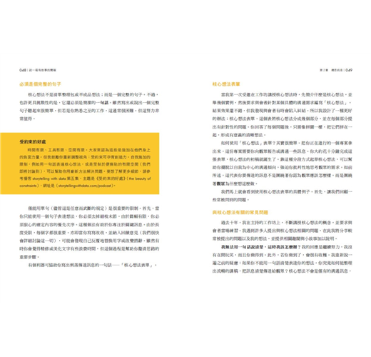 摘錄1_前言∥一切從一個故事開始 我十二歲的時候,投入學生自治會選戰。 當時我是中學生,第一次參選學生自治會幹部(senator)。我記得我花了不少時間苦思競選海報,希望一鳴驚人。我求我媽帶我去小鎮的生活用品店,挑選顏色超搭的海報板和顏料。我看得出該邀哪些朋友來幫忙能加分——例如麗莎的字是否好看到符合要求?選前,我的臥室地板堆滿了材料:尺(確保線條筆直)、字母模板(確保字型精準)以及製作徽章的器具。一大張貼在牆上的牛皮紙記錄了各種可能的競選口號。回想起來,敲定「挑選唯一,就投妮基」的口號算是滿糗的。 我還花了很多時間擬講稿。主要政見包括:在學生福利社賣剛出爐的餅乾,在足球場(而不是臭烘烘的體育館)舉辦露天舞會,將志工服務時間納入學校行事曆。我狂敲家裡的電動打字機,當小小螢幕出現打好的一行字,我都要停下來將這行內容一修再修,直到滿意為止,然後再進入下一行。那是一個精彩的演說。 投票日當天,我清楚記得自己走上體育館講台發表精心製作的政見時,一路上心情緊張忐忑。兩百張熟悉的面孔在台下滿懷期待地看著我。我開始念著自己撰寫的講稿時,手忍不住發抖。「大聲點!」有人喊道。我可以聽到自己的聲音在顫抖,還透過喇叭被放大。我呼吸困難。整體表現不盡如人意。 儘管不盡如人意,但我還是順利當選。顯然,餅乾的吸引力加分不少,足以克服我缺乏自信的表現。這代表我做對了一件事:我了解我的觀眾。這次演講的心得與教訓,我一直到後來才完全明白。雖然糕餅並非次次都是演說的選項,但演說總是與餅乾有關——確定哪些想法、機會、潛在的回報或未來的願景極具吸引力,讓聽眾或觀眾無法說NO。 ‧我如何踏上說故事之旅 我不是天生厲害的講者,也不是天生說故事的高手。我覺得自己個性內向,最自在的地方就是我現在坐著寫這本書的所在:獨自一人在我的筆電前打字。你根本猜不到我原來是這樣的人,因為我可以在擠滿觀眾的會議室自在地侃侃而談,或是站在舞台上自信地發表演說。這絕非偶然;而是經過審慎練習、不斷精進技巧的結果。雖然這絕對是刻意練習,但多少也令人好奇,因為我一開始並沒有打算成為說故事高手。 我大學畢業後第一份工作是在銀行服務。我當時剛從本科畢業,主修應用數學,所以在信貸風險管理部門擔任分析師。我工作勤奮,一直在尋找提高效率的做事方法,我對於分析數據以及用圖表視像化數據很有一套。我順利升遷。兩三年內,我有了自己的小團隊,負責每個月向風險長(CRO)和他的領導小組報告數據。 不過我仍然像當年的中學生,雙手發抖、聲音顫抖。這次的觀眾換成領導高層——大部分是男性,而且至少比我大十歲,讓我緊張不已。久而久之,我學會放下文件,這樣發抖的雙手就不會成為聽眾第一個注意的目標。深呼吸有助於穩定我的聲音。但我仍然有一個難以克服的挑戰:填充詞(filler words)。我不習慣句子與句子之間出現空檔,所以開口就滔滔不絕,基本上沒有停頓。如果想不到該用的詞,不會停下來整理思緒。反之,我會用「之類」、「呃」、「嗯」等填充字避免冷場。我試著靠一些小懲罰制止我愛用填充詞的習慣。我請旗下團隊透過電話視訊會議聽我對高層的每月彙報,計算我違規的次數。每犯一次,就罰一毛錢,因此我多次替小組的開心聚餐買單。不過,我與管理高層開會時愛用填充詞的毛病未見改善。 我的事業不斷成長,檯面下的工作表現也可圈可點,但我上台時乏善可陳的口頭報告無法替我辛苦準備的資料與研究結論充分加分。 二○○七年爆發信貸風險危機,我離開銀行業,將我多年累積的分析技能應用於另一個領域——Google「人力分析部門」(Google People Analytics)。Google的工作環境超讚,我非常感謝這份工作給我的回報讓我不斷精進。其中一個機會是能夠開一門課,教導他人如何有效地用數據溝通。 該課程的重點是將資料視覺化(可視化),這也是我一直感興趣的領域。推出後,資料視覺化成了受歡迎的課題,並推廣至Google在全球的分公司。這結果既讓人喜不自勝——也讓人非常害怕,因為我從來沒有正式當過講師!所幸我能報名參加公司內部一系列課程,幫助我學習如何授課。課程中,我學到的兩個簡單的技巧對我影響甚大,也永遠改變我的溝通方式:站起來以及別轉台。稍後你會聽到更多這方面的細節。 在Google工作的這些年,除了人力分析的核心工作,我還教授十多門關於資料視覺化的課程。學員來自Google的各個部門,包括業務、工程、產品、行銷和人力營運等等。我開始體認到不同類型的人溝通方式也有別。透過學員的故事和不同的教學情境,我進一步了解溝通可能遇到的情境、挑戰和機會。累積經驗之後,我設計活動,指導小組親自下海練習。若學員人數較多,我會把授課內容結構化,然後帶領大家討論分享。我受邀參與「我的第一次會議」(My First Conference),並上台致詞。有了口碑後,Google以外的職員也對我的課程感興趣,所以我受邀到其他公司授課。 二○一二年初左右,我清楚地知道,不只Google需要善用數據進行有效溝通,其實大家都有這樣的需求。所以我決定孤注一擲,將自己熱愛的計畫——用資料講故事,提升到另一個層次,我辭去白天的全職工作,集中心力希望在一次次的研討會上,讓世界漸漸擺脫多到爆的3D圓餅圖。一切由小而大