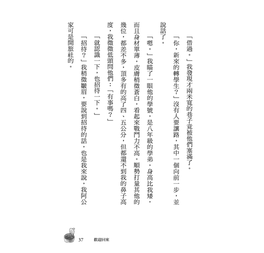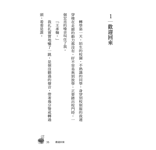 看起來是導護老師,只是怎麼知道我的名字。算了,不重要,我隨口應了聲表示聽到,但心裡卻忍不住嘀咕這轉學的時間點,真是莫名其妙,離畢業只剩下半學期,是怎樣?要叫我回鄉下跟阿公大眼瞪小眼,也等我國中畢業,搞得大家以為我被退學,拜託,那些沒常識的好學生和乖同學,什麼功過都沒有的我怎麼會被退學?