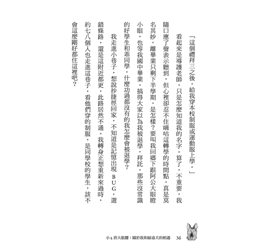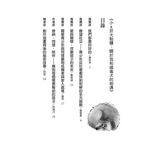 「沒有問題少年,只有少年問題」這句話,不斷出現在我閱讀《小k菸大骷髏:關於我和緝毒犬的相遇》的當下,也在讀每一篇章中浮現多張面孔(曾收容在少年觀護所的青少年),現今社會環境的多元與家庭的結構若不彰,青少年猶如浮萍亦是野草,而同儕間的影響與家庭關係不彰身心容易產生偏差,這時若又接觸到「毒品」更將人生複雜化,因戒毒是一輩子的拔河。我相信大多藥物成癮者是真的想戒毒,但為何卻越陷越深至痛恨到想放棄自我呢?書中提及運毒為籌措父親醫藥費的情節,好似我曾接觸過的一位少年個案,而被標籤化的人等於間接將他們邊緣化了;本書將本應單純卻不單純的青少年問題,用生動的故事連結在一起,非常推薦本書,以期正視陪伴關愛青少年與同理藥物成癮者與家人處遇的重要性。
