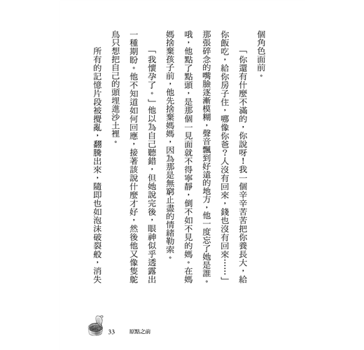 「你還有什麼不滿的,你說呀!我一個辛辛苦苦把你養長大,給你飯吃,給你房子住,哪像你爸?人沒有回來,錢也沒有回來,…」那張碎念的嘴臉逐漸模糊,聲音飄到好遠的地方,他一度忘了她是誰。哦,他點了點頭,是那個一見面就不得寧靜,倒不如不見的媽。在媽媽捨棄孩子前,他先捨棄媽媽,因為那是無窮止盡的情緒勒索。