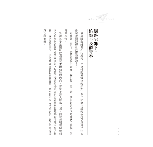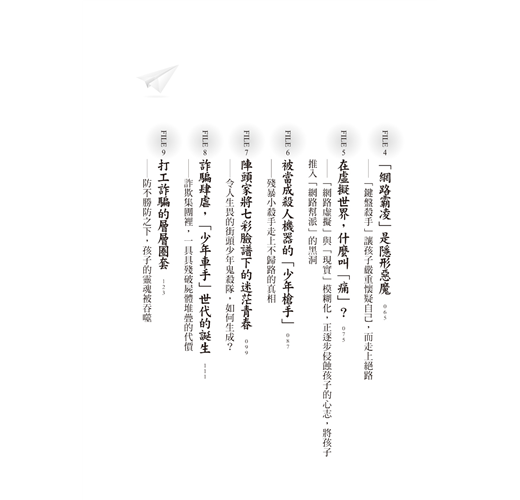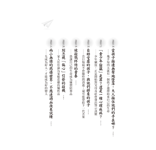 本書所舉的實際案例都是當前青少年犯罪中,最典型的例子,真實呈現出孩子們,如何在同儕誘惑、人際關係、社會環境、學校教育及家庭教養的漏接之下,逐漸迷失自我。