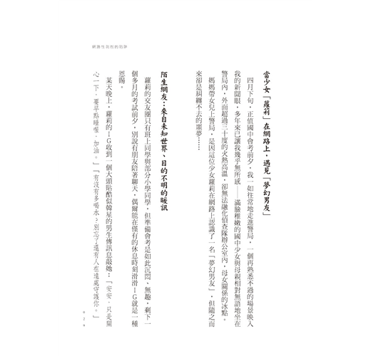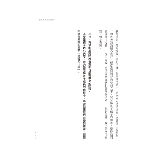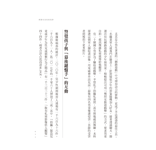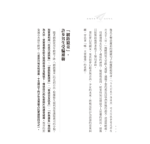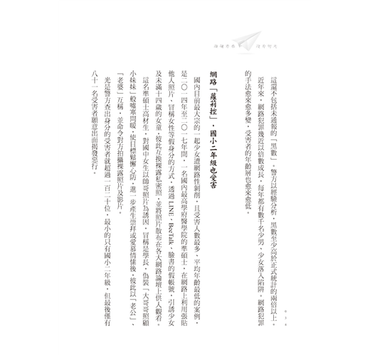 知己知彼,百戰百勝。為了讓外界深入了解這些環繞在孩子身邊的陷阱,認清誘騙手法與真實運作型態,我特別在書中點出時下兒童及青少年最容易陷入的、隱藏在身旁的陷阱,包括網路世代最常見的「網路性剝削」、「網路新型態犯罪」、「虛擬幫派」、「打工詐騙」、「網路霸凌」等,並解析新式犯罪手法,讓所有人知悉這些犯罪者在暗處玩著何種把戲。