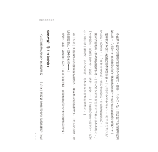 原本期待收到對方體貼的回應,沒想到映入眼簾的卻是如利刃刺入心房的激烈話語:「你想分手了嗎?你是不是在玩弄我的感情?」「你不愛我嗎?愛我的話,現在就給我你的裸照。」「你現在給我,我就不會生氣……」