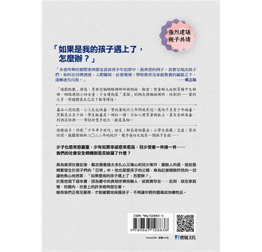 怵目驚心的新聞事件,卻是孩子身處的「現實世界」:網路性剝削陷阱、毒品入侵校園、打工變犯罪、少年自殺年年遞增、校園狼師的共犯結構,法律束手無策、父母椎心悔恨,與無數受了傷、甚至喪亡的年輕生命……