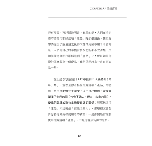 我在本章姑且把耶穌稱為一項「產品」,並非表示祂是被製造出來的,而是方便讀者了解文中的意義,我想以我對這項「產品」的認識,耶穌應該不會生氣,因為祂是為了被你我使用而出現。