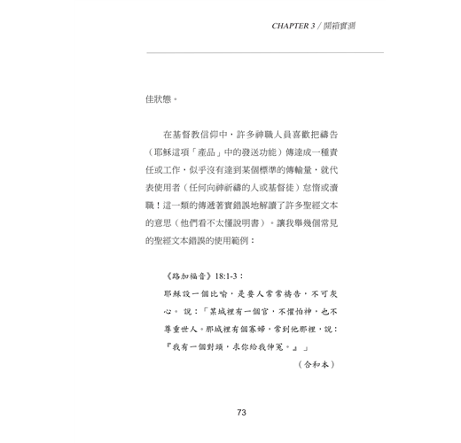 這兩個名詞在本書中毫無用處,因為這本書既與宗教無關,也非以宣示我個人之信仰告白為目的;它,很單純,就是一本使用手冊,無關宗教、無關信仰、不分聖俗。無論男女老幼、學生、上班族、家庭主婦,基督徒抑或不是基督徒都適合閱讀。不論你是上述哪一個族群,我相信你若花時間閱讀它,就會在不知不覺中學會「使用耶穌」。或許在一開始這樣胡說一通有點擾人,但我只是要闡述: