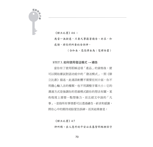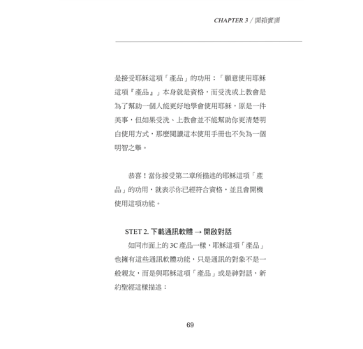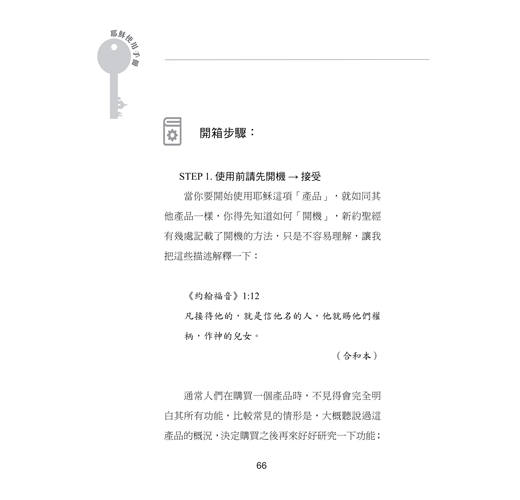 我的雙親將近八十歲,早已到了隨心所欲的年紀,他們大概是在15年前開始使用智慧型手機。一開始,他們使用起來非常不順手,所以必須透過使用說明書來孰悉這項產品;但後來我的父母決定透過他們的兒子來幫忙設定、輸入重要親友的電話號碼、下載常會使用的APP……。我想有許多讀者跟我一樣,都經歷過這個過程,其目的就是為了讓我們的長輩能充分使用現代科技。但讓我感到驚奇又錯愕的是:科技和智慧型手機的發展太快速,使我們這些非3C重度 使用者也得努力學習才跟得上。因此在「使用耶穌」之前,讓我們先透過這本使用手冊來熟悉一下耶穌這項產品。