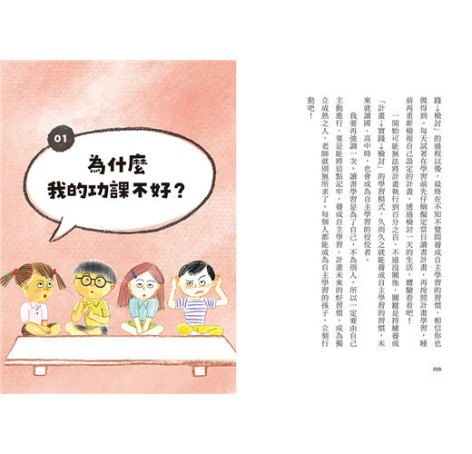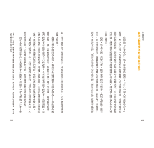 看完這本書後,孩子也嘗試寫下自己的學習計畫表,和我一起商量怎麼把想學的事情安排進去,雖然進展有些緩慢,但看著他比過去更有目標、更開心的讀書,我也領悟到成績高低真的不代表一切。學習是一輩子的事,快樂去做,才能夠長久。——家豪媽媽(臺灣讀者)