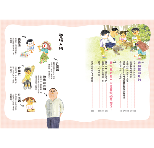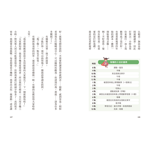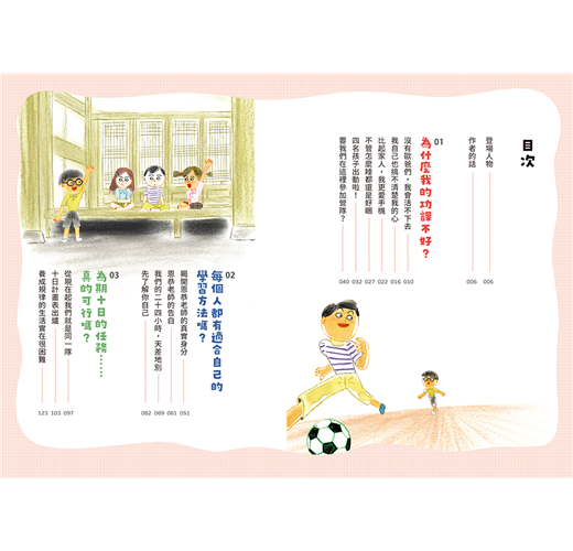 這本小說裡的四個主角,他們也有這樣困擾,對於學習提不起興趣,也找不到方法改善。透過這為期十天的夏令營,四個小朋友隨著超有個性的恩恭老師一步步探索自我,最終找到了自己熱愛的事情,更學會安排最適合自己的學習計畫,往夢想邁進。過程中自然也少不了彼此磨合、自我掙扎的橋段,例如愛用手機的燦敘躲進廁所裡假裝便祕,只為了想再多玩一下遊戲;身為追星族的素苡,讀書時老是想大聲唱歌,惹得其他孩子頻頻抗議,反思後才發現這樣其實無法專心,反而浪費更多時間;一直以來都沒什麼目標的有娜,本來十分苦惱自己好像對任何事都興趣缺缺,直到跟著老師去餵養流浪貓,才意外發現隱藏天賦,決定朝向獸醫之路邁進……每個孩子或多或少都能從這四位主角當中看見一部分的自己,而跟著書中提供「計畫表」、「自我評價表」、「成功紀錄表」,大家一定可以輕鬆學會如何安排學習進度。就算計畫不如預期也沒關係,只要再重新擬定成自己能夠遵守的計畫就可以了,透過這樣無數次的練習,孩子也能夠培養出面對挫折的勇氣。