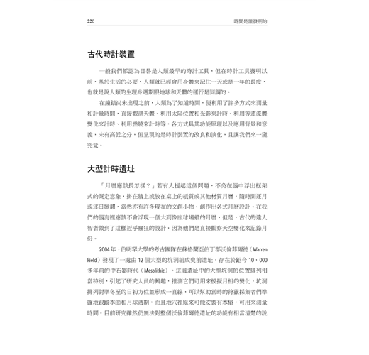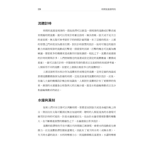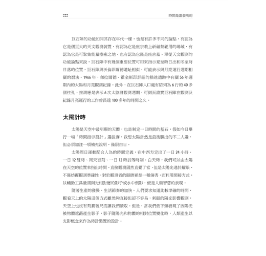書中包含各種文化中時間觀念的差異,以及這些觀念如何影響人們的日常生活和文化發展,引導讀者思考時間的本質,並探討它對人類社會的重要性。同時,以古鑑今,來看時間的測量和記錄如何推動科學和技術的發展,並對世界的全球化和跨文化交流產生影響。讓讀者對時間這一主題有更深入的認識,同時也激發了他們對科學、歷史和文化多元性的興趣。