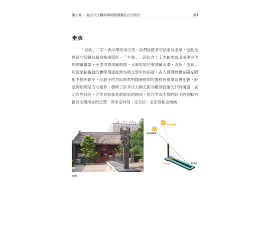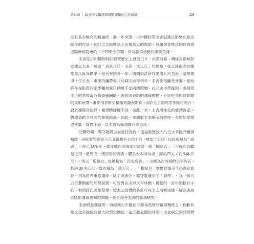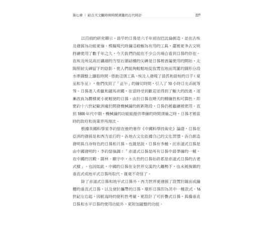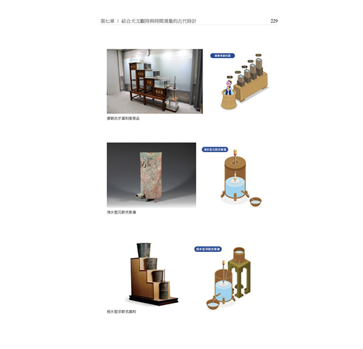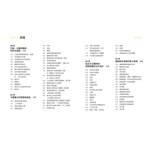 第七章《結合天文觀時與時間測量的古代時計》展示了古代時計裝置的多樣性,從太陽計時到沙鐘、燈漏等各種計時裝置,這一章節揭示了古代人們觀測時間的智慧和創造力。