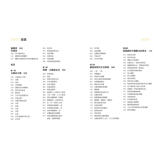 第一章《太陽系之歌》開啟了這部書的序幕,從太陽系的成員到各個行星的特性,再到地球的位置和結構,這一章節為讀者揭示了宇宙的基本構造和天體運動的奧秘。