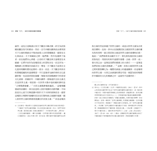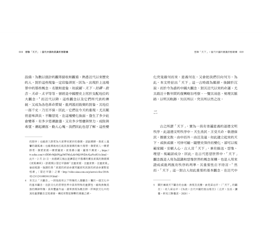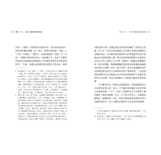 另外兩篇後來寫成的文章,一篇以「文明」為主題,另一篇討論「家國天下」的當代言述,二文均圍繞當代「天下」論述中的關鍵詞展開,其內容雖與前文略有重複,但側重點不同,可以被視為本書主題的細化和拓展。因此,這兩篇文章雖然都獨立成篇,但放在前文提供的框架裡來閱讀顯然更合適。