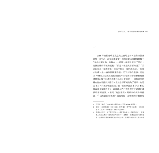 2018 年央視春晚在北京的主會場之外,設有四個分會場,其中之一設在山東泰安,用的是泰山東麓燭峰腳下「泰山封禪大典」的舞台。一時間,媒體上充斥了歷史上有關封禪的釋義和記載。於是,普通民眾都知道了「天命以為王,使理群生,告太平於天,報群神之功」的泰山封禪,是一樁象徵國家鼎盛、天下太平的盛事。而有 35 年歷史且已成為國家項目的中央電視台春節聯歡晚會選擇泰山腳下封禪大典舞台為其分會場之一,同時以多語種向海內外播出其節目,當然也不單純是為了娛樂。也是在 2 月,央視春晚播...