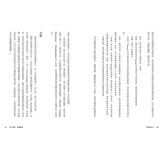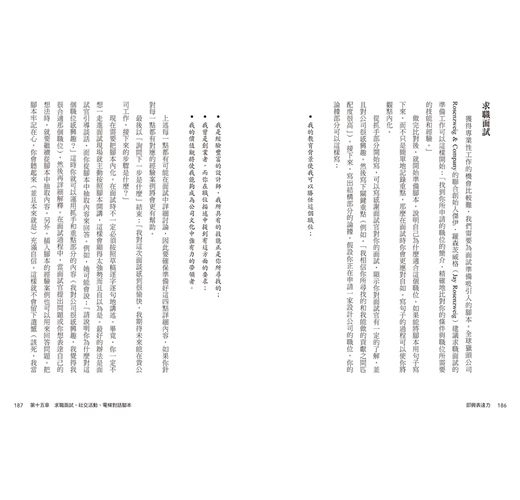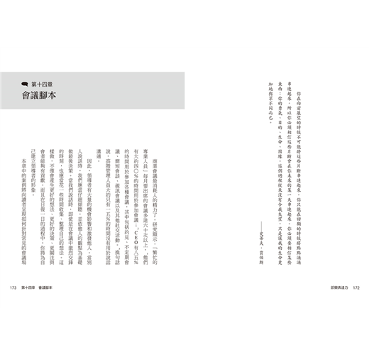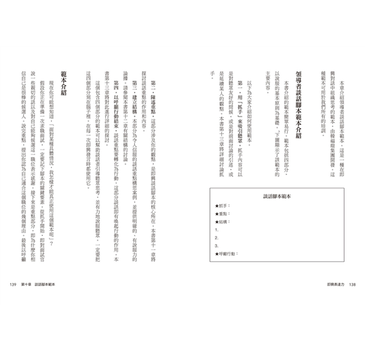 第四部分,各種場合的即興演講腳本,為讀者提供腳本範本,讀者可以在相應場合使用這些腳本,包括會議、求職面試、社交活動、電梯談話、小型演講、致敬詞、祝酒等即興演講或互動場合。