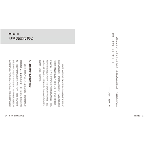 即興演講是一種少數人掌握的藝術。然而,對於領導者來說卻是一項重要的技能,這裡的領導者絕不僅指那些掛著頂級頭銜的高階管理者,還包括那些希望自己待人接物周到、言談有說服力的各層級領導者。善用即興演講使我們有能力在日常情境中增加影響力、激勵別人。