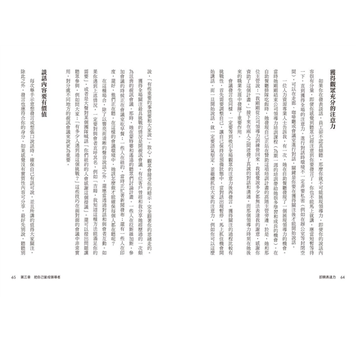 如果你在發表談話,員工卻不認真傾聽,那麼你就不可能展現領導力。即便你的說話內容很有分量,即便你感覺到聽眾已經注意到你要發言了,你也不能馬上就講,應當短暫等待一下,直到獲得全場的注意力。進行對話時環境不一定非要私密(例如在辦公室等封閉空間),可以在走廊、咖啡廳或會議室進行對話,關鍵是你要在獲得關注後才能開始說話。