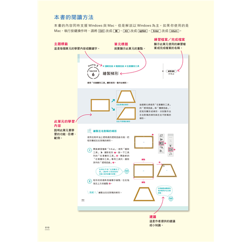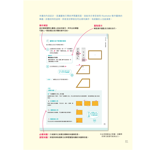 以精心挑選的素材為基礎,從設計原理、繪製圖形技巧,如矩形、圓形、多邊形,