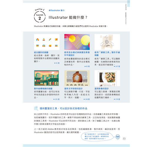 到用線條畫出簡單的插圖、操作物件、瞭解圖層結構、運用文字設計作品、編輯影像、