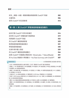 本書介紹多種擴充功能,包含能和ChatGPT展開對話練習的語音功能、調整朗讀文本的口音及語調、擷取長影片要點主旨和逐字稿、進行更精確的文章翻譯、自製單字卡等多樣化功能,打破ChatGPT只能用文字溝通的侷限性。