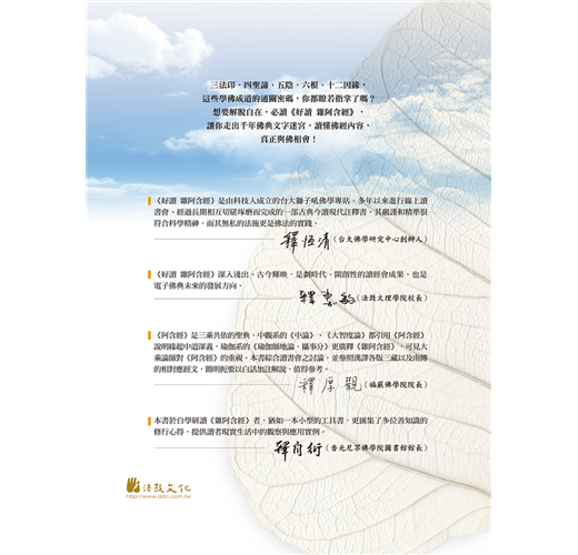 本書於自學研讀《雜阿含經》者,猶如一本小型的工具書,更匯集了多位善知識的修行心得,提供讀者現實生活中的觀察與應用實例。 ——釋自衍(香光尼眾佛學院圖書館館長)