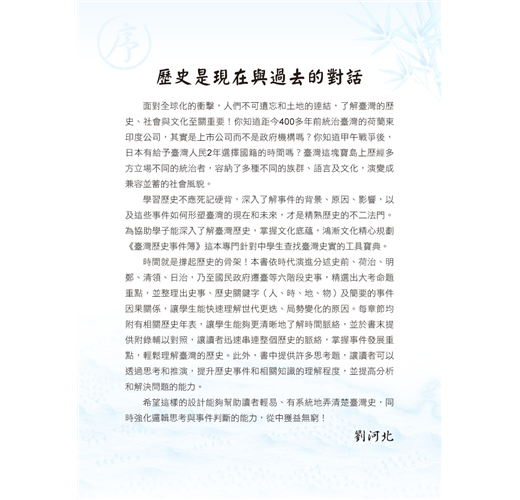 希望這樣的架構設計能夠幫助讀者輕鬆、有系統地搞懂臺灣史,同時強化邏輯思考與事件判斷的能力,從中獲益無窮!