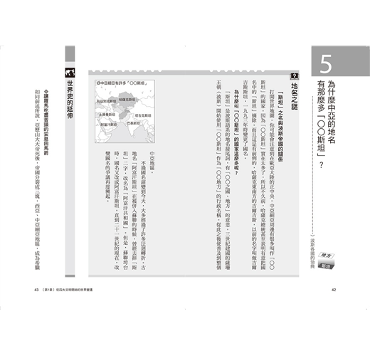 因此,本書不是單純地按照時間順序來解釋世界通史,而是在敘述世界史的主題前,特別設計了「關於地理、地名、地圖的趣味雜學知識」: