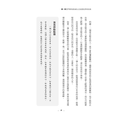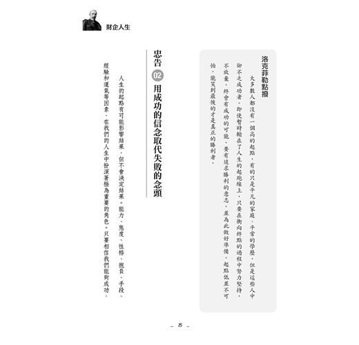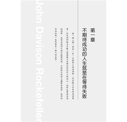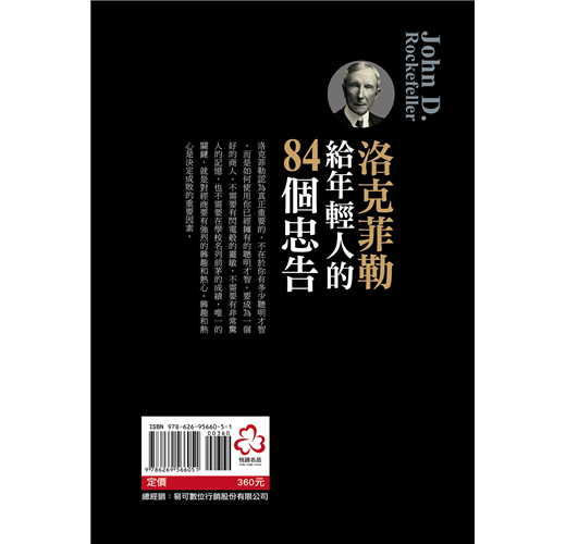 《洛克菲勒給年輕人的八十四個忠告》正是從洛克菲勒的思想精華,他在書中將事業成功、富可敵國的秘訣娓娓道來。洛克菲勒簡單的話語裡蘊藏著豐富的人生哲理和無盡的財富,不僅使洛克菲勒家族的後人受益,同時也指引了很多處於迷茫中的人。