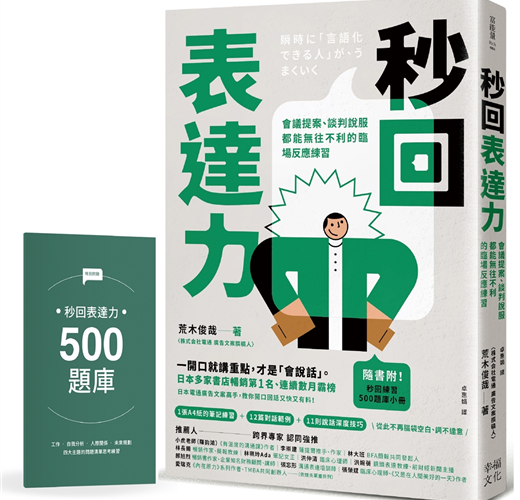 另外,如果天天練習的話,可能會不知道該提出什麼問題,因此隨書附贈「秒回表達力五百則訓練題庫小冊」,提供給各位讀者練習時的參考。