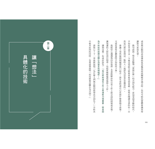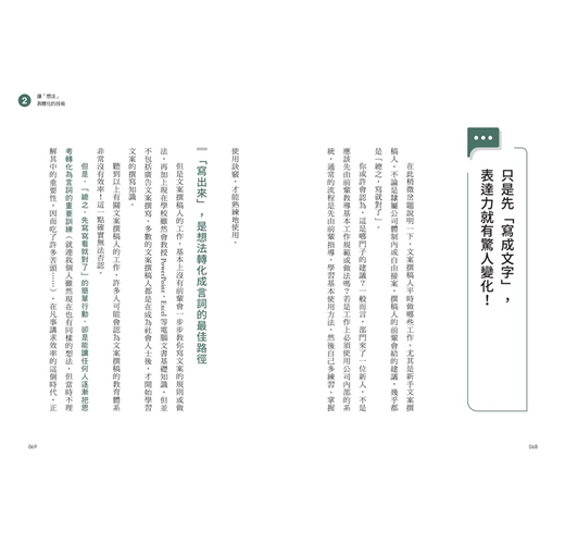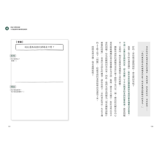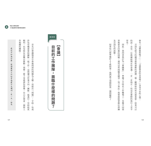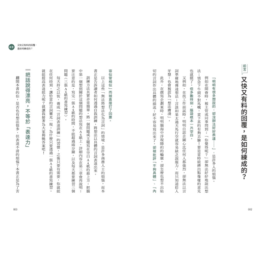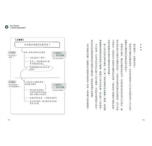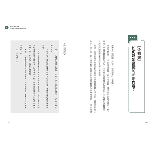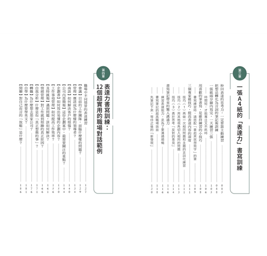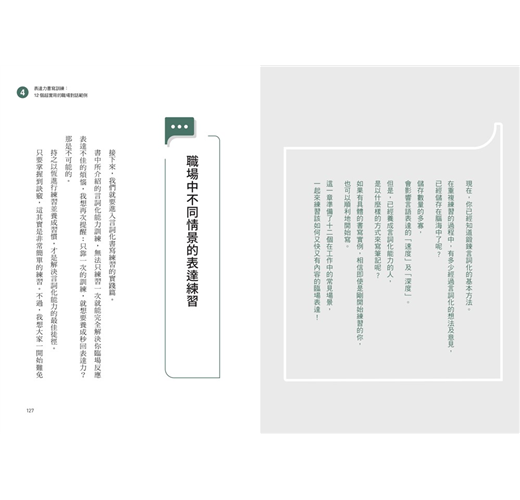 第三章,介紹如何增強言詞化能力的具體書寫練習過程;第四章的「實踐篇」,則是模擬不同的商務場合,並提供具體的訓練範例。